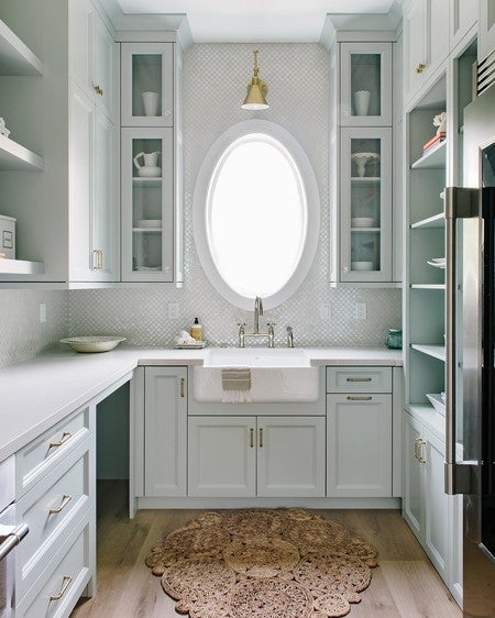 It's always fun when something added for utility — in this case, to protect kitchen walls from water and worse — is used as an excuse to add beauty.